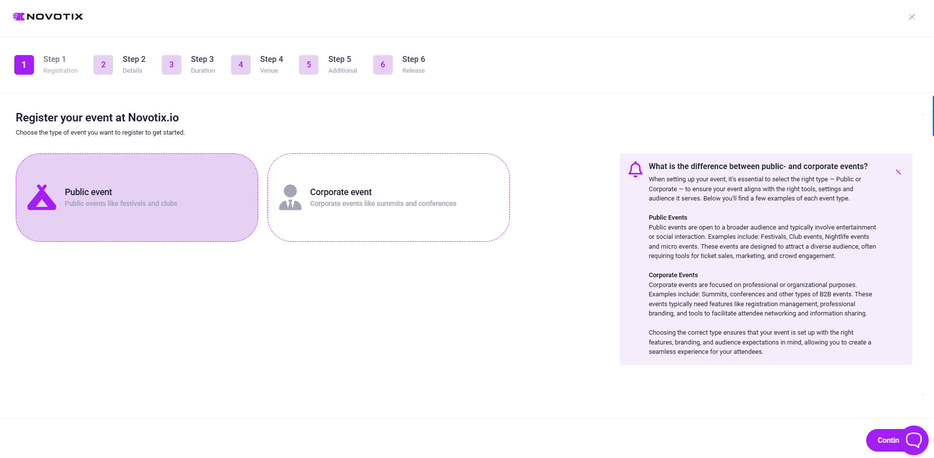 After selecting the event type, click Continue.
